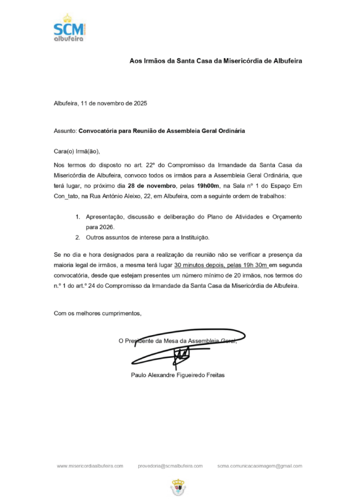A Santa Casa da Misericórdia de Albufeira informa todos os irmãos que se realizará a Assembleia Geral Ordinária, no próximo dia 28 de novembro, às 19h00, no Espaço Em Con_tato – Sala nº 1, Rua António Aleixo, nº 22, em Albufeira.
