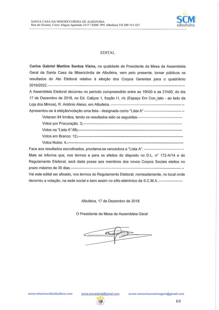 As eleições dos Corpos Gerentes da Santa Casa de Misericórdia de Albufeira, para o quadriénio 2019 – 2022, decorreram no passado sábado, dia 17 de Dezembro.
