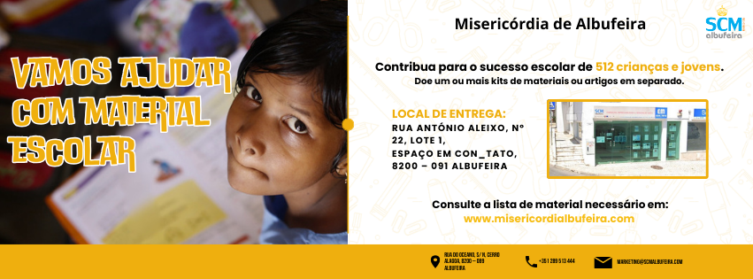 Até 31 de outubro, a Misericórdia de Albufeira promove a campanha solidária «vamos ajudar com material escolar.» A iniciativa de angariação de material não usado visa combater as assimetrias entre alunos e dar resposta às necessidades de 512 crianças e jovens, de vários níveis de escolaridade.